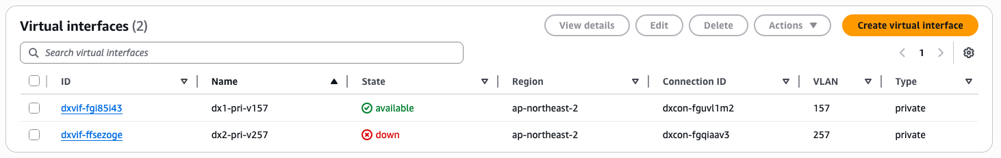 - AWS DX <-> onPrem connect 간 VIF 생성