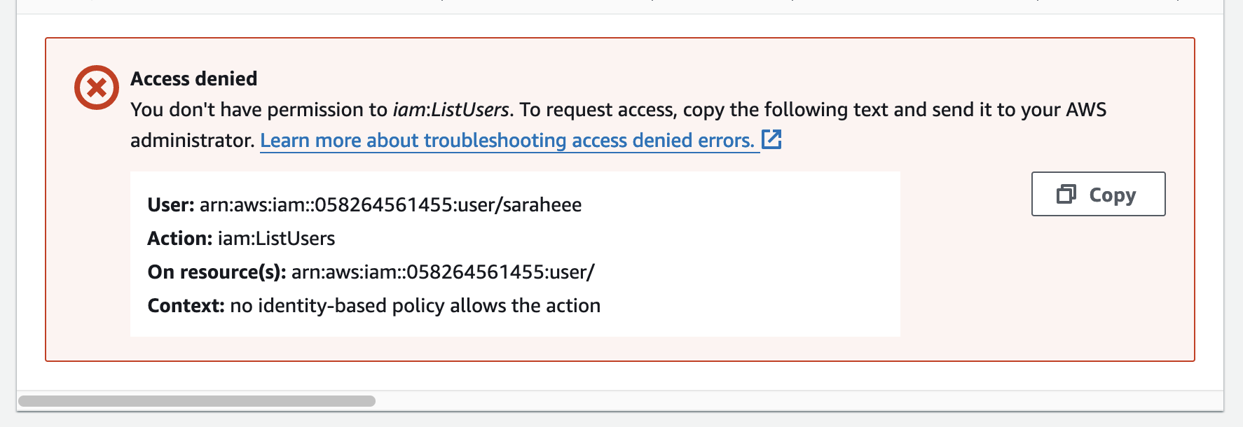User group was not created. User: arn:aws:iam::058264561455:user/saraheee is not authorized to perform: iam:CreateGroup on resource: arn:aws:iam::058264561455:group/dev because no identity-based policy allows the iam:CreateGroup action