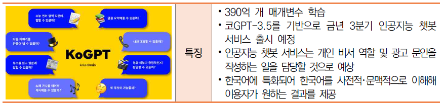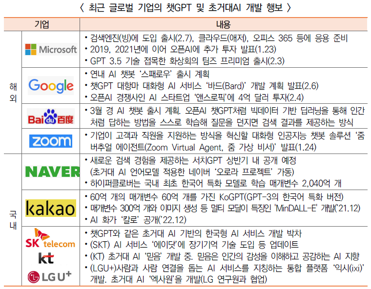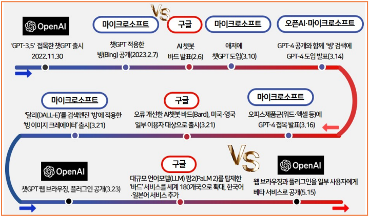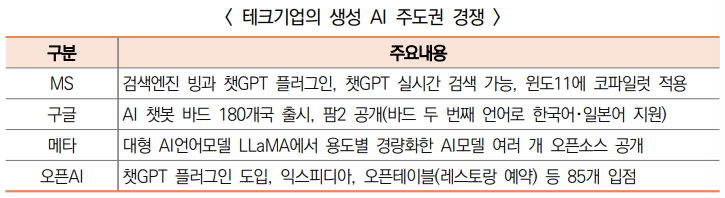 - 올해 초 챗GPT 열풍을 주역으로, 자사의 검색엔진, 애저, 윈도 오피스 제품군에 이미지 인식까지 가능한 GPT-4를 적용하는 등 생성형 AI 시장을 선도하고 있는 것도 경쟁력
