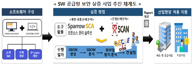 제품・서비스 개발단계: 스패로우의 ‘Sparrow SCA’라는 오픈소스 관리 솔루션을 통해 SBOM 생성, 취약점 분석・조치 및 컨설팅 등을 수행, 취약점을 분석할 때는 보안 취약점 공통식별자 목록(CVE, Common Vulnerability Exposure) 등을 활용