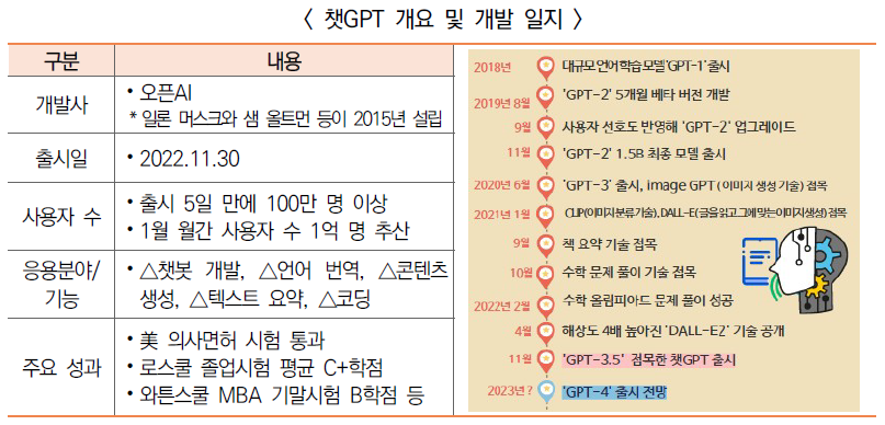 [제4호(2)] ChatGPT의 등장과 주요국의 개인정보보호 규제 동향 1. 생성형 AI와 ChatGPT (1) 생성형 AI의 개념과 특징 (2) 생성형 AI의 장·단점 (3) ChatGPT의 등장 2. ChatGPT에 대한 주요국의 개인정보보호 규제 동향 (1) 주요국의 ChatGPT 사용금지 검토 (2) OpenAI의 대응 (3) 주요국의 AI 규제를 위한 법안 마련 3. 요약 및 시사점 (1) 요약 (2) 시사점