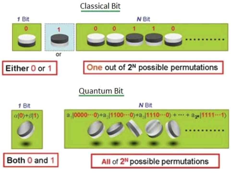 2개의 양자 중첩상태를 정보의 단위 비트로 활용한 것이 큐비트(qubit)이며, 양자 중첩상태와 얽힘의 특성을 활용하는 것이 양자 컴퓨팅