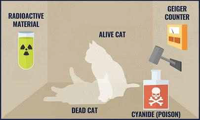 슈뢰딩거 고양이의 중첩상태 개념 / 광자 2개의 얽힘 예시자료 : https://theabingtonian.com/1678/features/schrodingers-cat-groundbreaking-crazy-or-both/