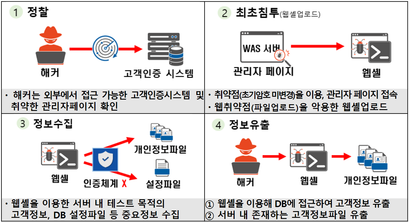관리자의 DB접근제어 등 인증체계가 미흡하여 해커가 웹셸을 이용하여 파일을 유출해나갈 수 있었음