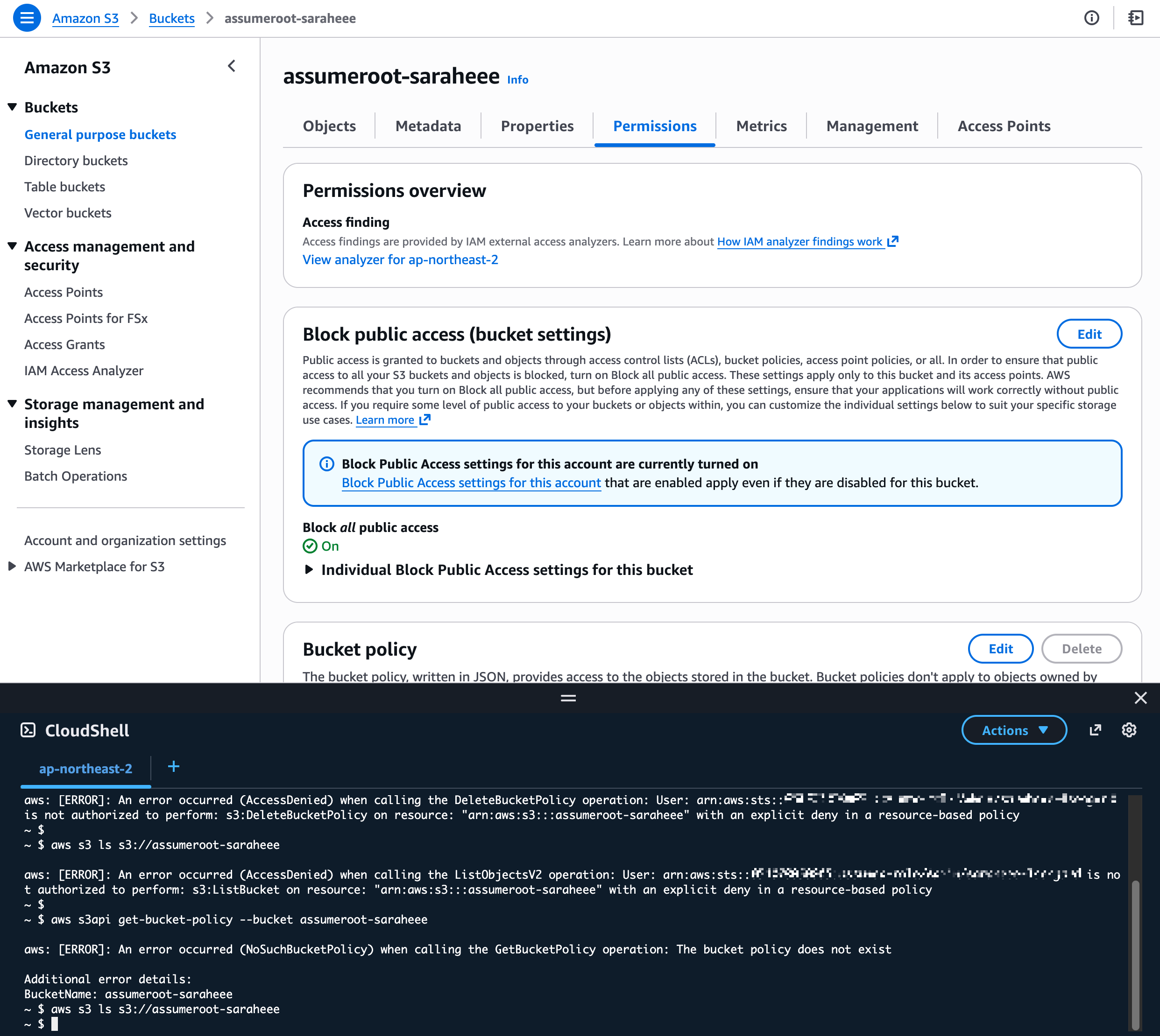 # 버킷 정책 삭제 시도 → Access Denied