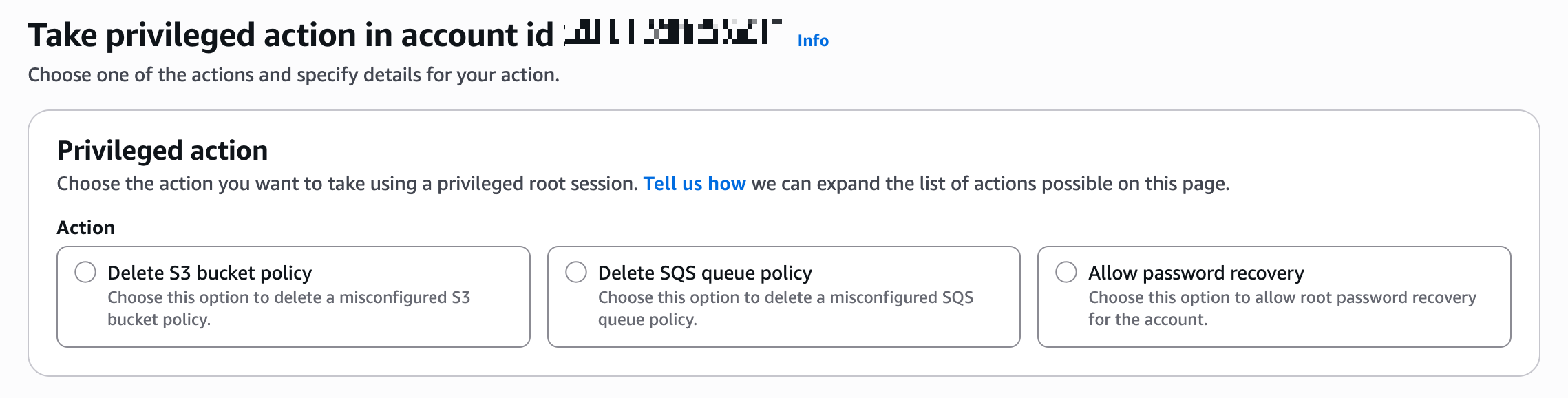 관리 계정(또는 Delegated Admin 계정)의 콘솔에서 Root access management로 이동하여 Take privileged action을 수행합니다.