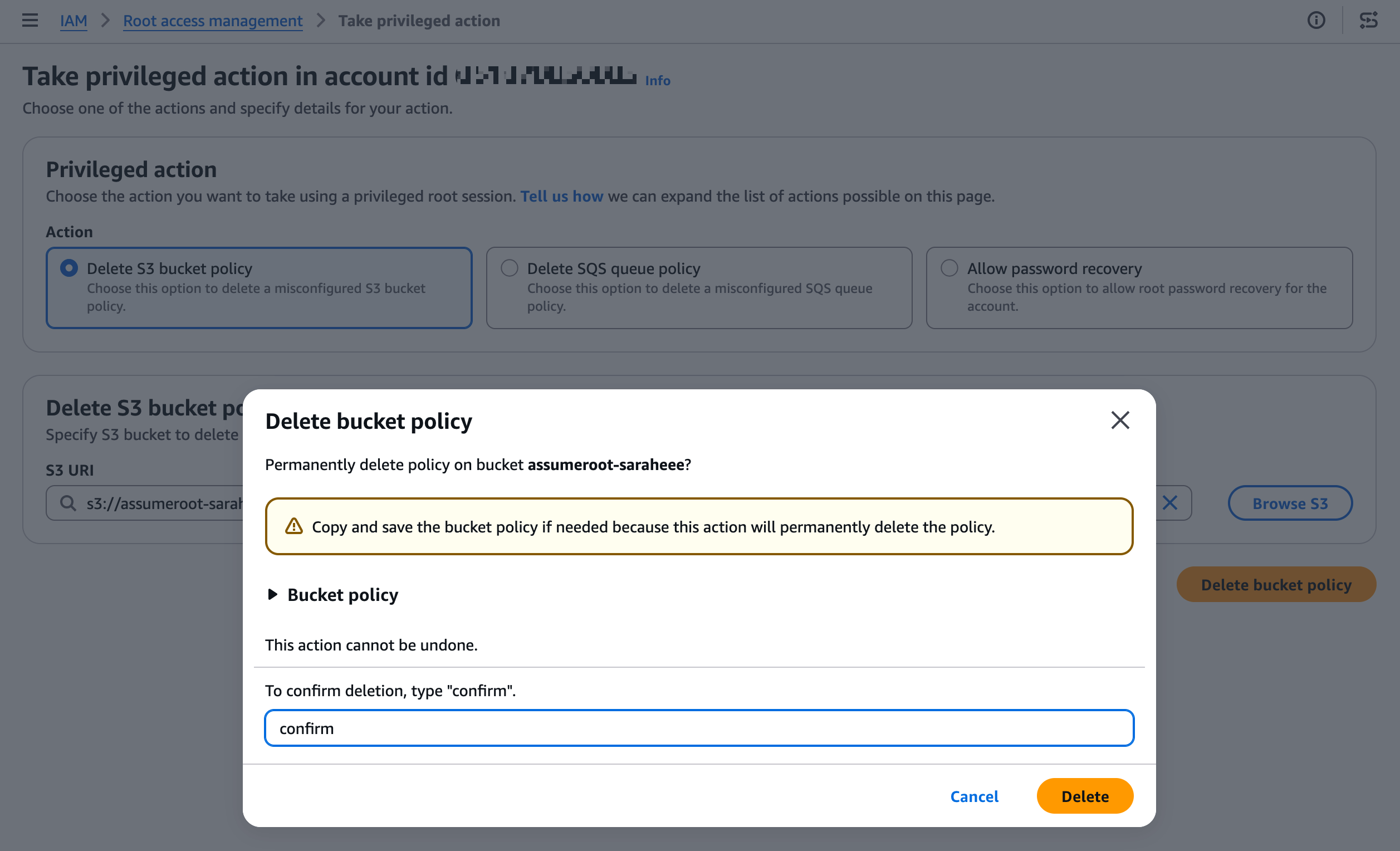 Delete S3 bucket policy 작업을 선택하고, 잠긴 버킷을 지정하여 정책을 삭제합니다.