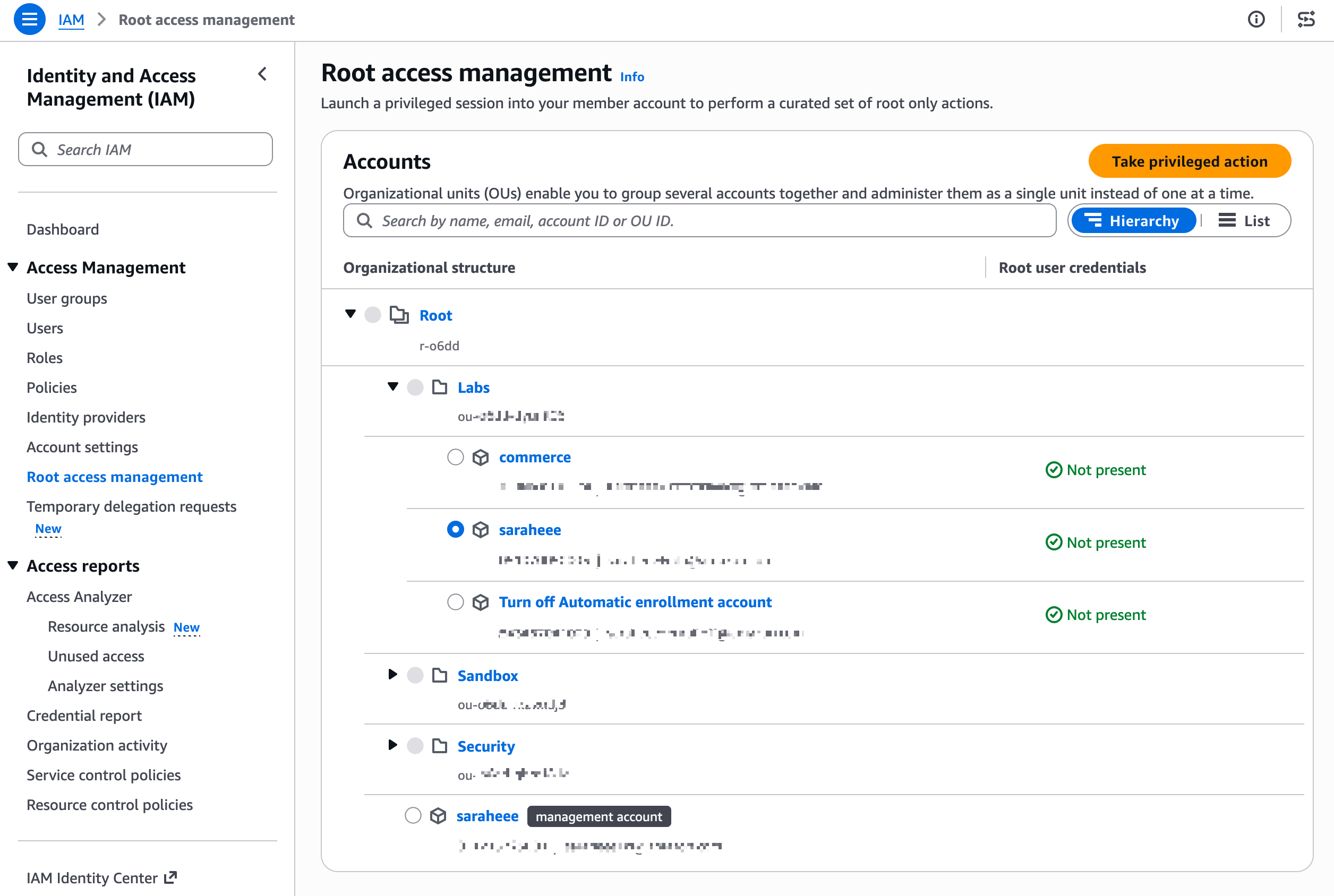 Management Account에서 Root Access Management를 활성화합니다.