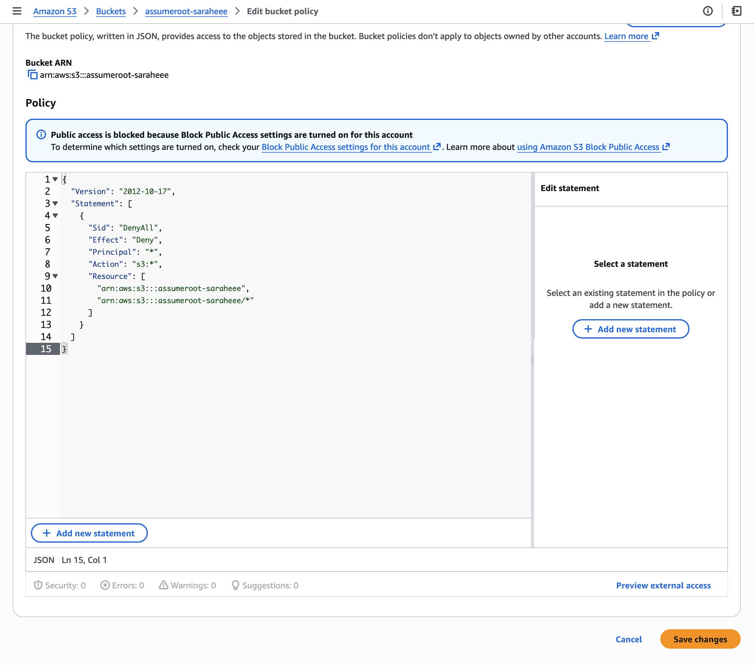 버킷 소유자 포함 모든 IAM 자격증명으로 접근이 차단되었는지 확인합니다: