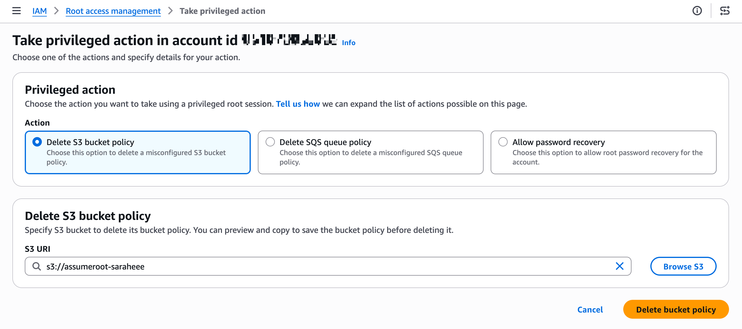 # 3. Root 세션으로 작업 수행 (예: S3 버킷 정책 삭제)