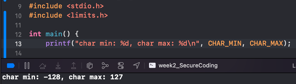 printf("char min: %d, char max: %d\n", CHAR_MIN, CHAR_MAX);