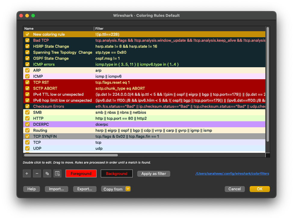- Warning (노란색): 잠재적 문제, TCP 윈도우 크기 0, 중복 ACK 등