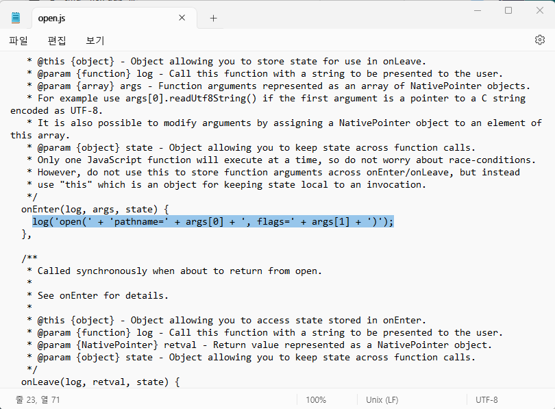 onEnter function의 args를 통해 호출 인수가 어떻게 접근이 가능한지 알아볼 것