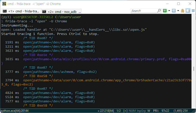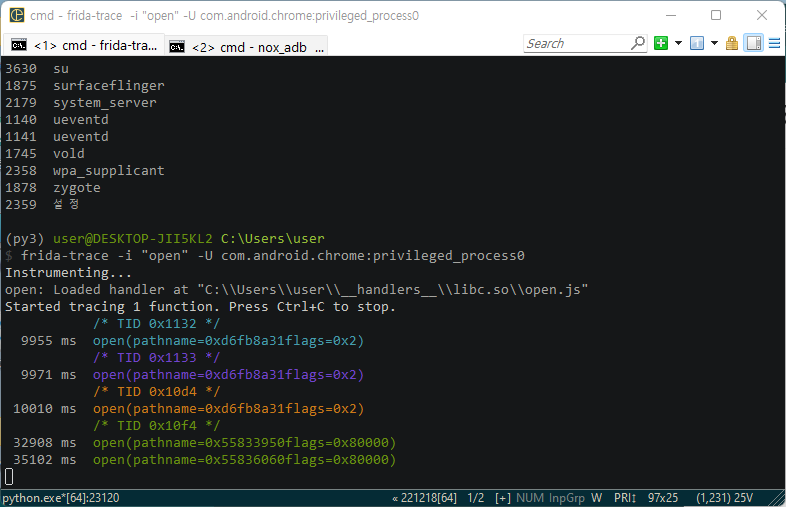 $ frida-trace -i "open" -U com.android.chrome:privileged_process0