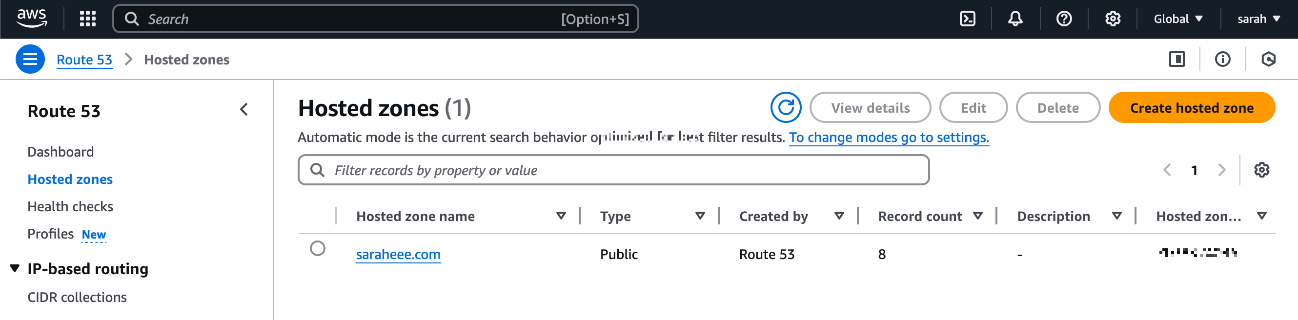 1) Route 53 console의 Hosted zones 내비게이션 바 클릭 > Hosted zone name 클릭