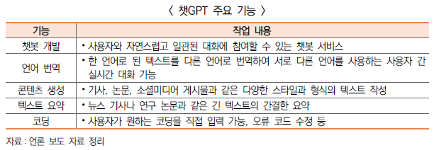 → 챗GPT 서비스의 보급 속도는 전례 없는 속도(공개 5일만인 '22.12.4일(현지 시간) 사용자 수가 100만 명 이상에 달함)