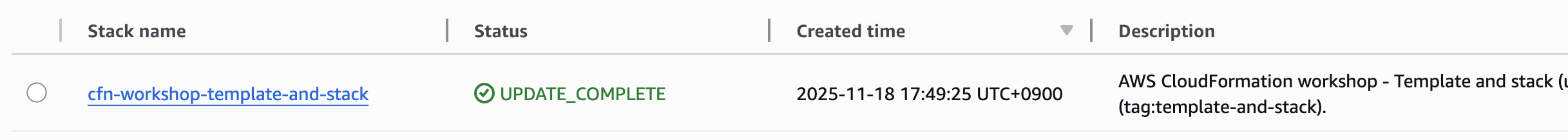 "StackId": "arn:aws:cloudformation:us-east-1:xxxxxxxx7753:stack/cfn-workshop-template-and-stack/xxxxxxxx-xxxx-xxxx-xxxx-0e672ed843db"